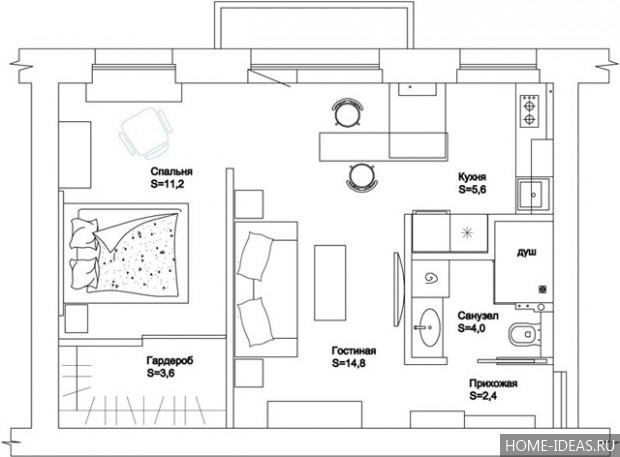 Пример планировки однокомнатной квартиры-студииИли же, наоборот, небольшую, но функциональную «двушку». Чтобы получить последний вариант, можно сделать следующее: кухонную зону перенести в кладовую, а на месте бывшей кухни обустроить спальню. Несущая стена, которая находится между прежней кухней и прихожей, остаётся на месте, что позволяет сделать планировку более удобной.
