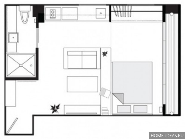 Планировка студии, учитывая малую площадь помещения, подразумевает разделение пространства на функциональные зоны.