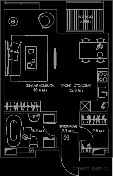 Однокомнатные квартиры благодаря своей невысокой стоимости являются на рынке недвижимости одним из самых востребованных вариантов. На рисунке ниже представлена типовая планировка однокомнатной квартиры, которая очень популярна среди молодых семей без детей, вчерашних студентов, а также начинающих предпринимателей.