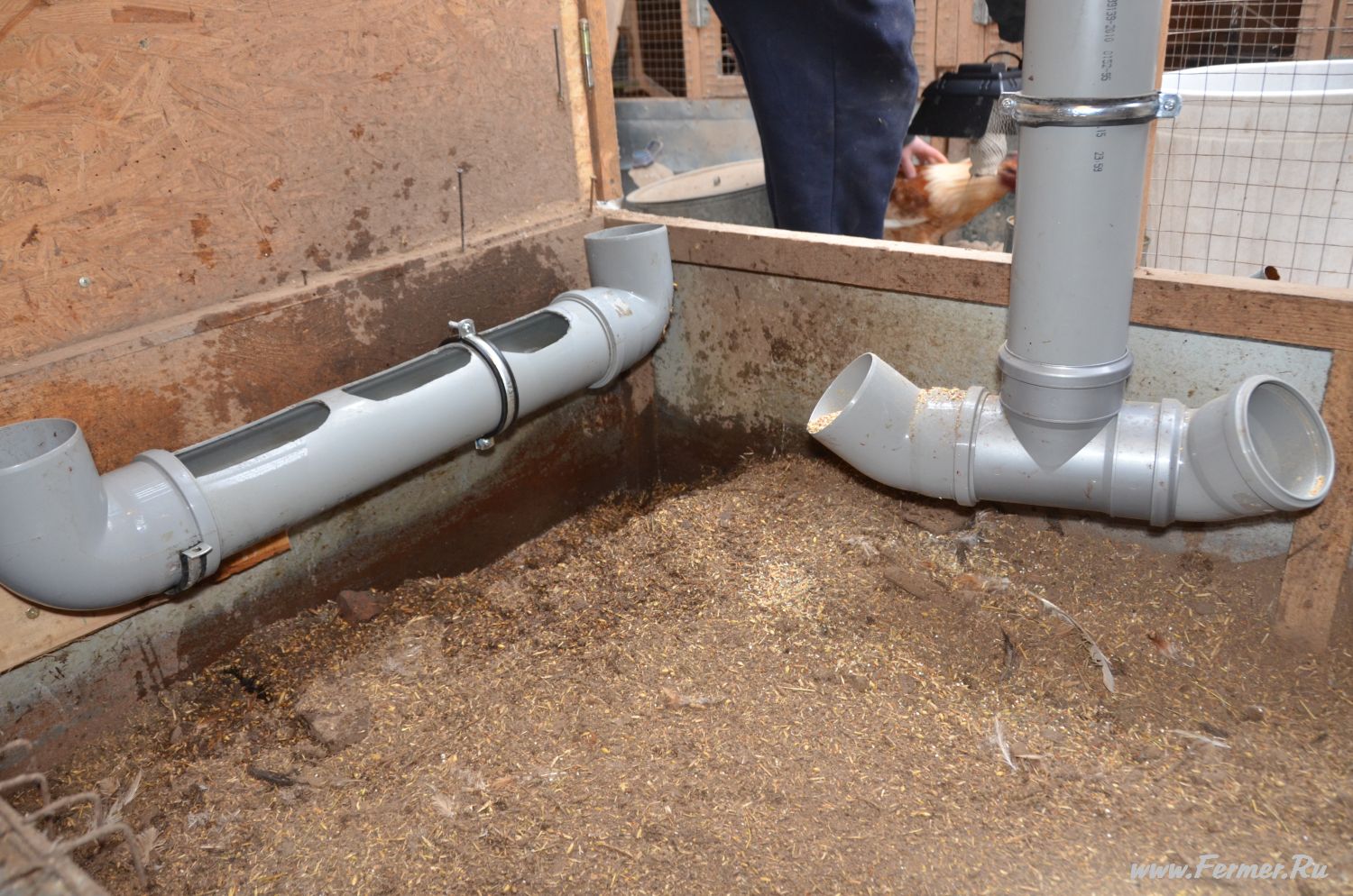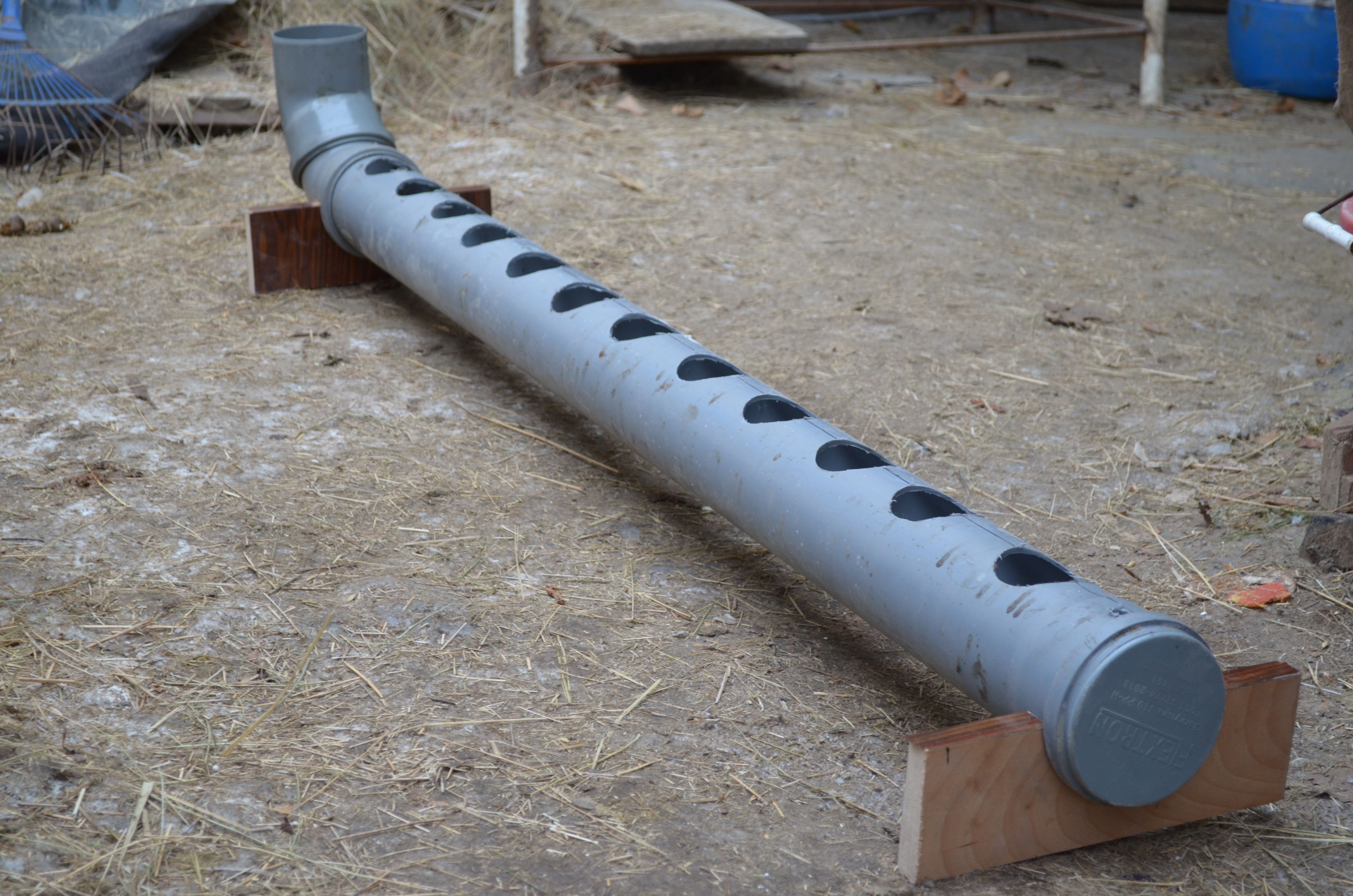 Самое простое решение — к вертикальному куску трубы прикрепить соединительное колено. Такое устройство станет прекрасным вариантом в том случае, когда птицы в хозяйстве не слишком много. Такое приспособление достаточно зафиксировать на стене курятника.