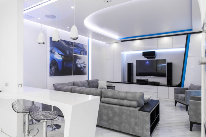 - Хай-тек. Глянцевые поверхности со сложной системой освещения или различной подсветкой, идеально впишутся в интерьер в стиле хай-тек.