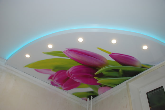 В этой части белые потолки могут быть как одноцветными, так и комбинированными. Прихожие в квартирах типа «хрущевка» тесные. Здесь редко делают фотопечать, потому что рисунок способен визуально снижать высоту потолка. Не устанавливают и перфорированные конструкции. Помещение довольно близко к уличным загрязнениям и вся пыль из подъезда будет оседать на нижнем слое. Оптимальное решение для маленьких прихожих — стандартный матовый потолок с достаточным количеством спотов. Коридор должен быть хорошо освещен.