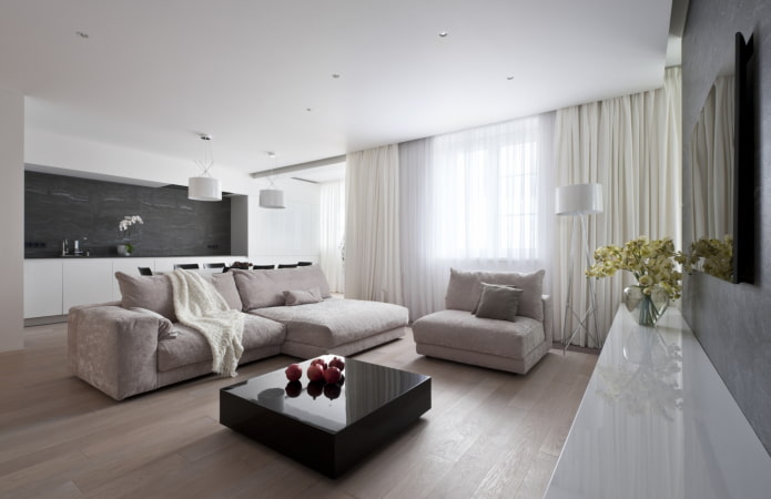 Белый потолок приемлем в зале любого стиля. Для создания минимализма глянцевую отделку совмещают со светлыми стенами и полом. В двухуровневых конструкциях используются яркие цвета — например, красный. Но такое решение годится лишь для помещений с высотой потолков более 2,5 м, ведь пространство существенно «сжимается». Подчеркнут чистоту и белизну цвета контрастные черные плинтусы.