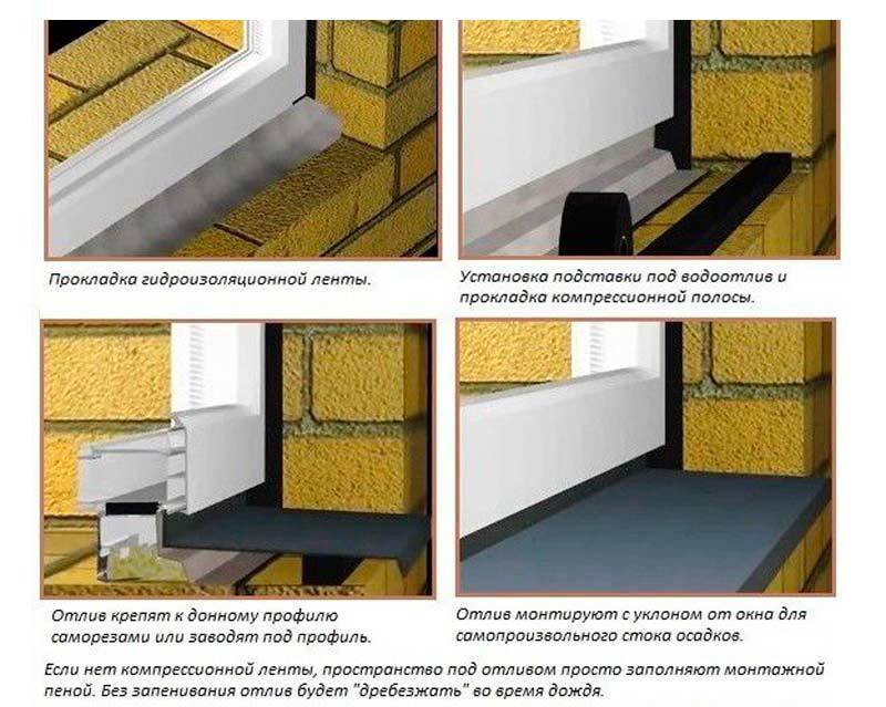 Это способствует уничтожению рамы и снижению герметичности пластиковых окон. Такая ситуация может возникнуть при замене старых окон на новые, если отлив расположен выше, чем внутренний подоконник. В этом случае используют системы дополнительных профилей и подбирают окна к уже существующему широкому наличнику.
