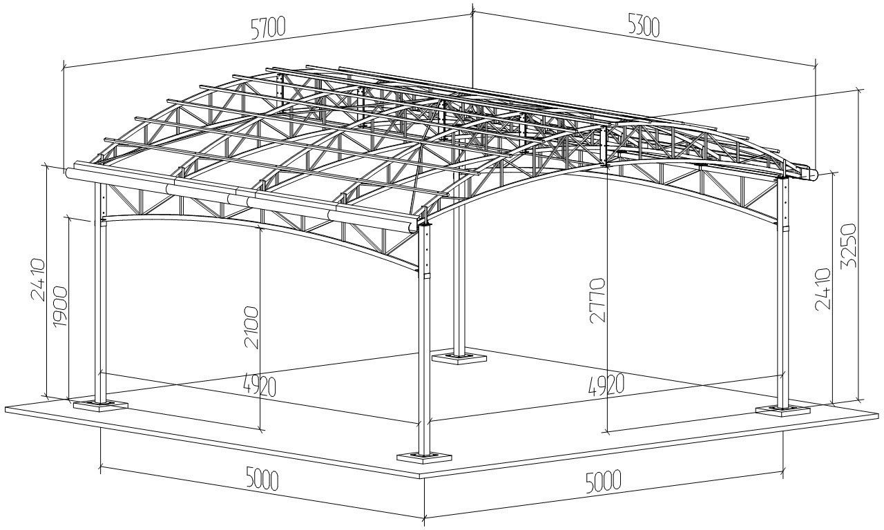 - Обычная схема. Здесь так же изображен арочный навес, однако в данном случае предусмотрены дополнительные опоры у крыши. Это делает ее более прочной и способной выдержать гораздо большие нагрузки, чем в предыдущем случае. Нарисовать подходящий чертеж вы вполне можете самостоятельно, что позволит, например, поменять размер навеса с 5,5х2,5 на размеры своего двора.