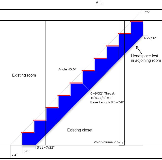 Расчет потолочного проема необходимо выполнять, чтобы избежать неудобств при эксплуатации лестницы. Расстояние от лестницы до края потолочного проема должно быть таким, чтоб человеку не нужно было наклоняться при спуске и подъеме.