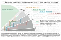 От угла наклона конструкции, зависит размер подступенка. На рисунке ниже представлены оптимальные углы наклона для разных видов лестниц и пандусов. Оптимальный угол наклона в жилых помещениях это 24-37°, что соответствует примерно 140-180 мм, на рисунке область выделена зеленым цветом.