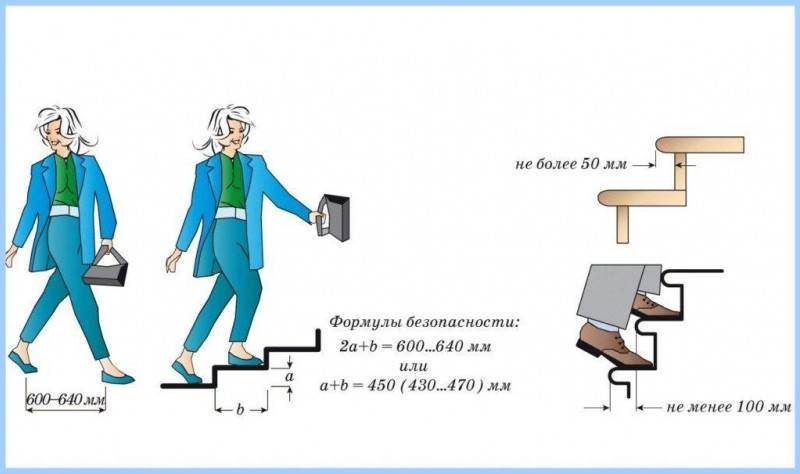 Для определения ширины ступени удобнее воспользоваться формулой, приведенной на рисунке, зависимость ширины шага (600-640 мм) и высоты подступенка. Есть ряд ограничений, которых надо придерживаться при расчетах:
