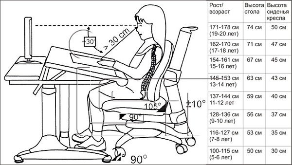 Когда стул по высоте не сбалансирован со столом, работать в таком положении затруднительно. Из-за необходимости всё время наклоняться, можно заработать близорукость. Поэтому при изготовлении мебели для сидения пользуются стандартными размерами, рассчитанными для среднестатистического человека: