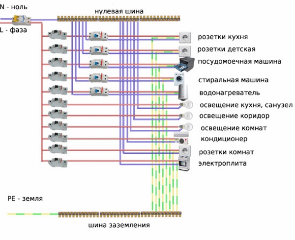 Для корректной работы нулевой провод, приходящий от шины на каждое из УЗО, далее направляется именно на свою отдельную группу. Если перепутать, и отправить его на другую линию, оставив фазу на своей, устройство защитного отключения будет постоянно срабатывать, как в случае соприкосновения нейтрали с заземлением. Это происходит из-за возникновения разности потенциалов на катушках УЗО.