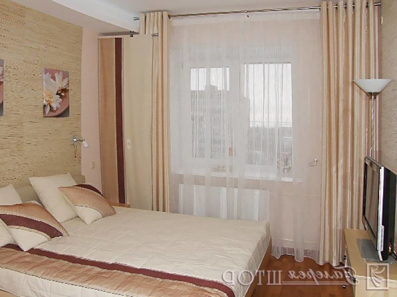Здесь не нужно ничего лишнего, никаких сложностей кроя и тем более многослойных драпировок. При этом вставки можно дополнить лаконичной портьерой на люверсах. Асимметричное оформление на одну сторону можно поддержать текстильной вставкой из аналогичного материала сверху по всей длине стены.Оформить шторами дверь с выходом на лоджию либо балкон в спальне можно, используя полотнища на люверсах, включив в комплект римские шторы длиной до подоконника. Полотно, находящееся перед самой дверью, может иметь длину немного больше. Главное, что нужно учесть: оно не должно мешать прохождению домочадцев. Несмотря на то что спальня считается местом, где приветствуется вуаль и мягкие фалды, не стоит завешивать окно таким текстилем полностью, провоцируя раздражение каждый раз, когда понадобится воспользоваться балконом.