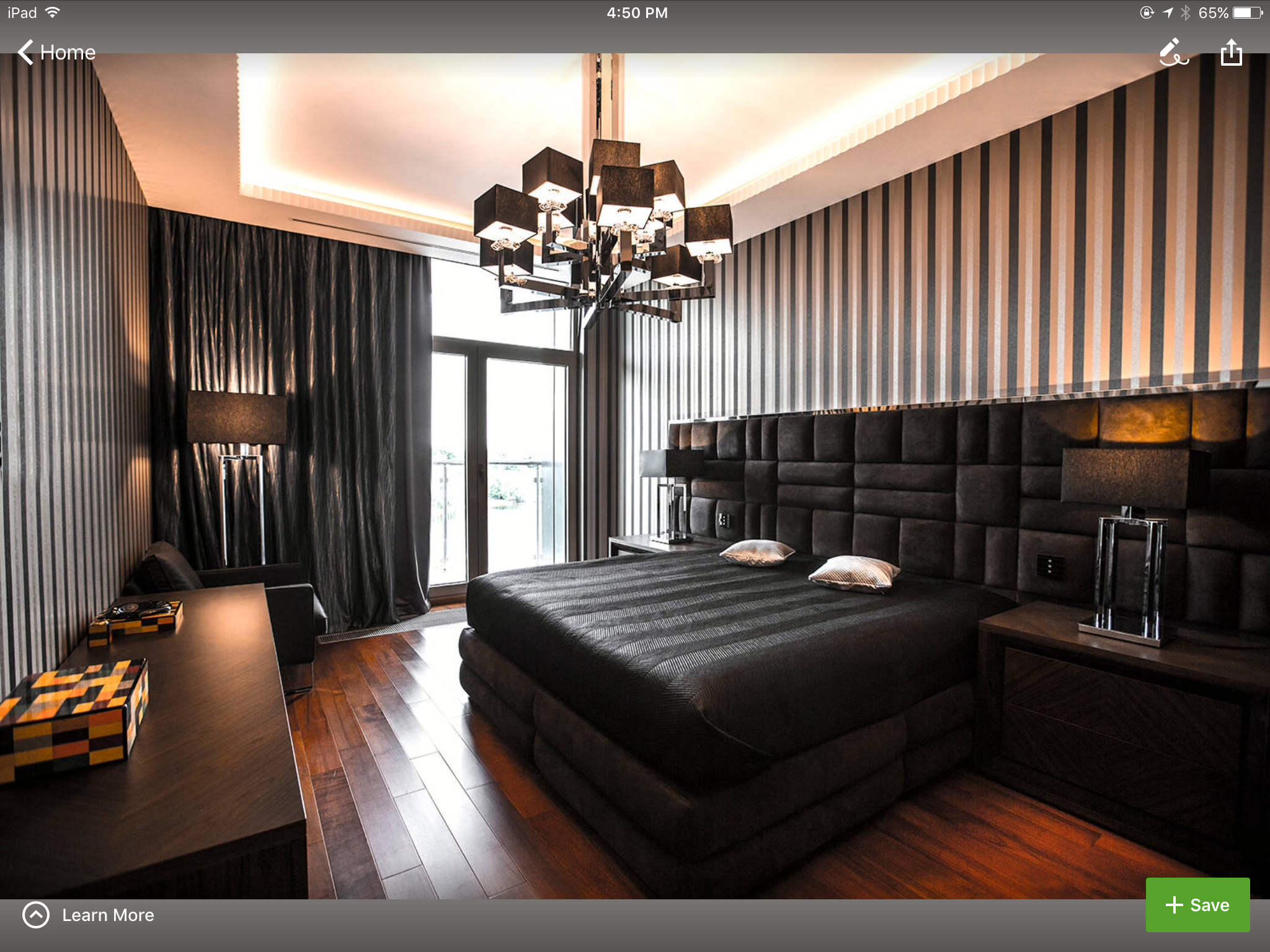 Дизайнер украсил эту спальню просто потрясающе. Комната наполнена темными тонами, но по-прежнему выглядит удобной для сна или приятного времяпрепровождения, слушая музыку в одиночестве.