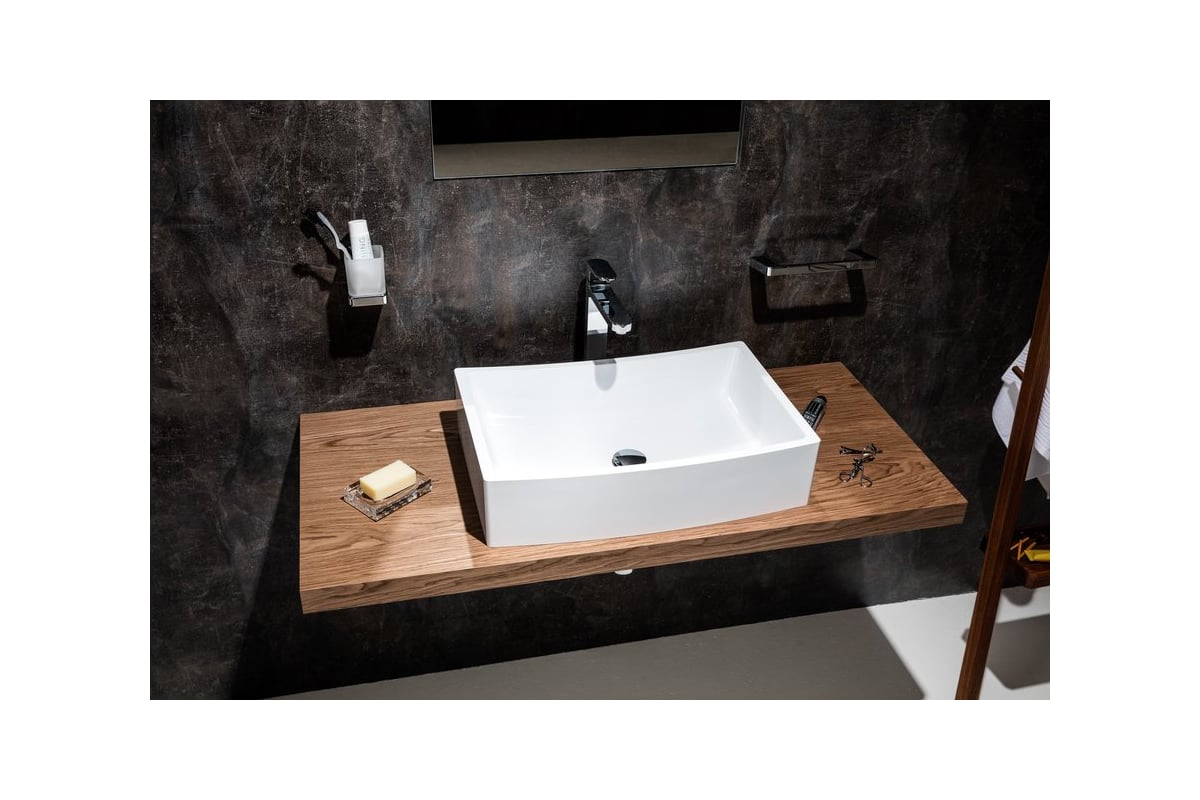 В этом случае не придется вырезать для раковины посадочное отверстие и всегда есть возможность подобрать любую конфигурацию раковины на столешницу в ванную комнату под заданный размер.