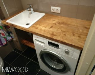 Данный вариант особенно практичен в случае размещения стиральной машины под столешницей в ванной в пустом пространстве, если ее дверь открывается вперед.