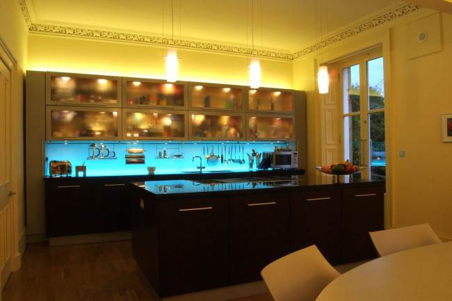 При установке под кухонным островом они придают драматический оттенок декору и создают впечатление плавучести устройства. Особенно приятно выглядит, если пол имеет красивый цвет или интересную текстуру.