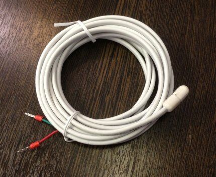 Термодатчики контактного типа имеют вид длинного провода с утолщением на конце. С одной стороны они подсоединяются к блоку терморегулятора, а с другой – размещаются в специальной длинной гофрированной трубе под полом. Такая особенность монтажа позволяет легко заменить поломавшийся датчик на новый.