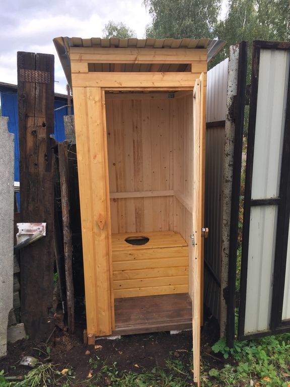 Уличный туалет для дачи по стандарту имеет высоту 2–2,2 метра. Ширина и глубина кабинки варьируется от 0,9 до 1,5 метра. При выборе габаритов рекомендуем руководствоваться комплекцией жильцов.