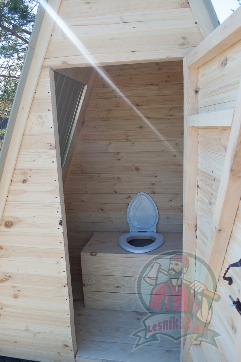 Деревянный туалет треугольной формы с двухскатной крышей.