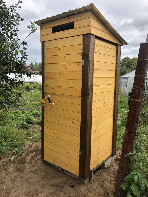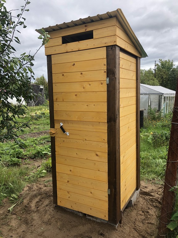 Уличный туалет для дачи по стандарту имеет высоту 2–2,2 метра. Ширина и глубина кабинки варьируется от 0,9 до 1,5 метра. При выборе габаритов рекомендуем руководствоваться комплекцией жильцов.