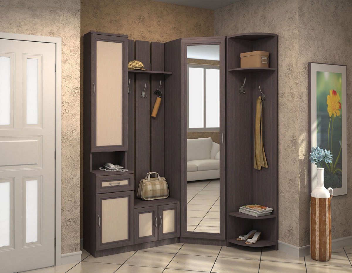 Если вместительность конструкции не стоит на первом месте, то небольшая треугольная или трапециевидная модель замечательно впишется в любую прихожую.