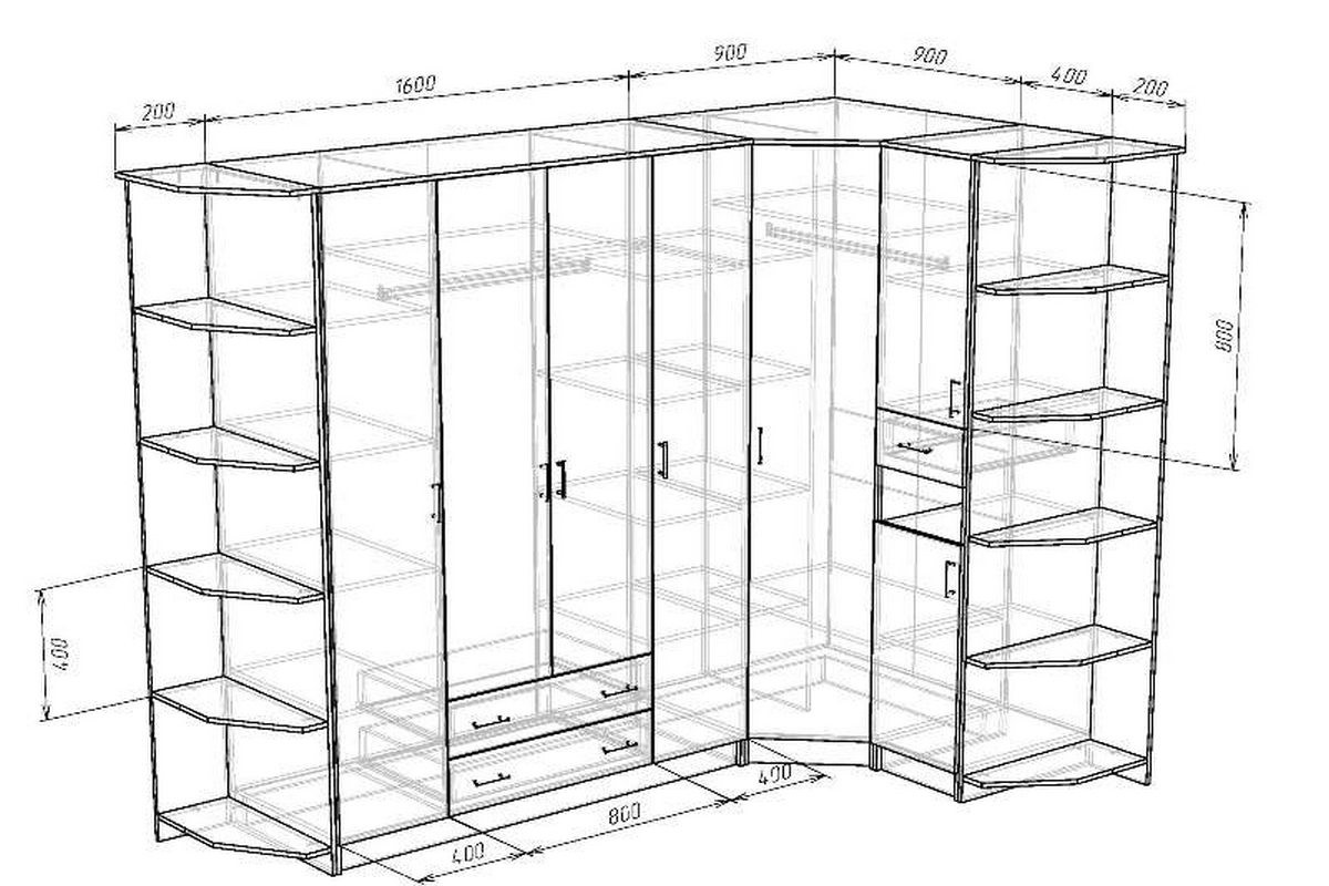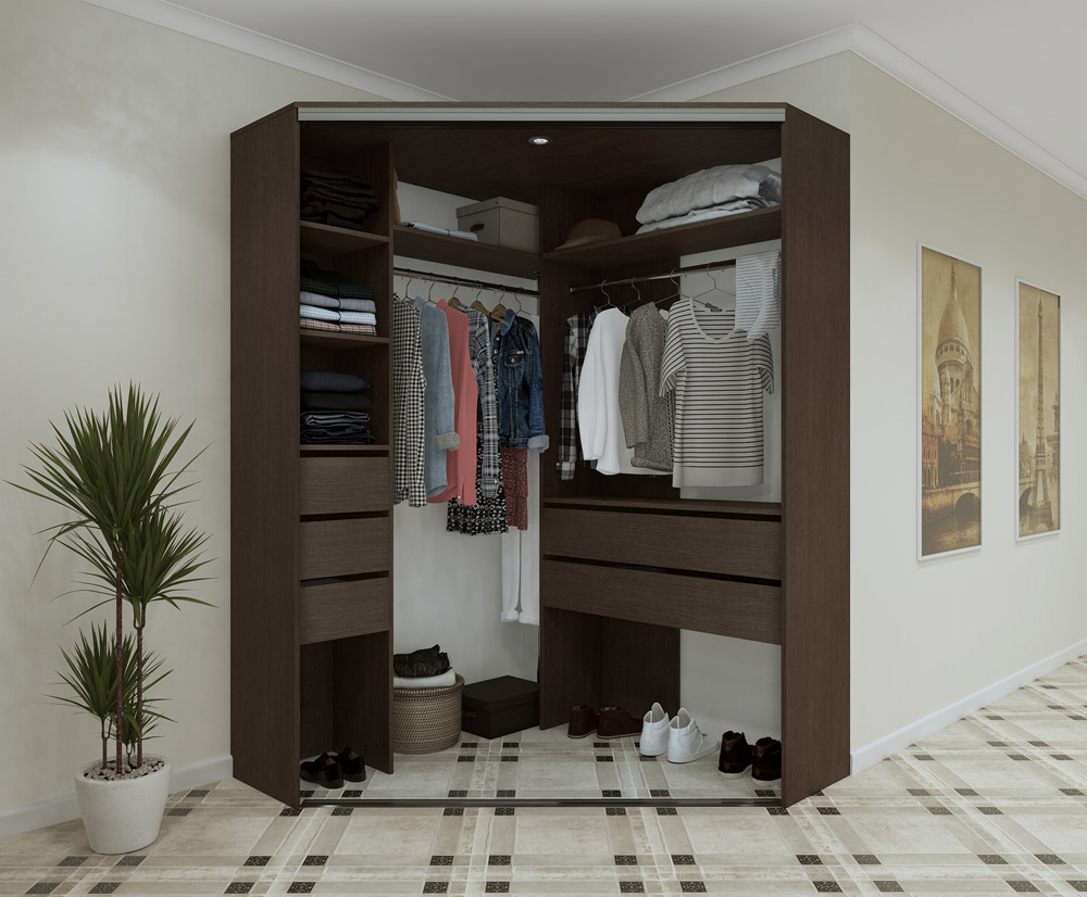 Шкаф-купе, состоящий из двух примыкающих друг к другу модулей, имеет в плане форму буквы «Г». Одна из частей, более широкая, обычно предназначается для верхней одежды и имеет штангу, которая занимает угол. Короткий модуль оснащается полками.
