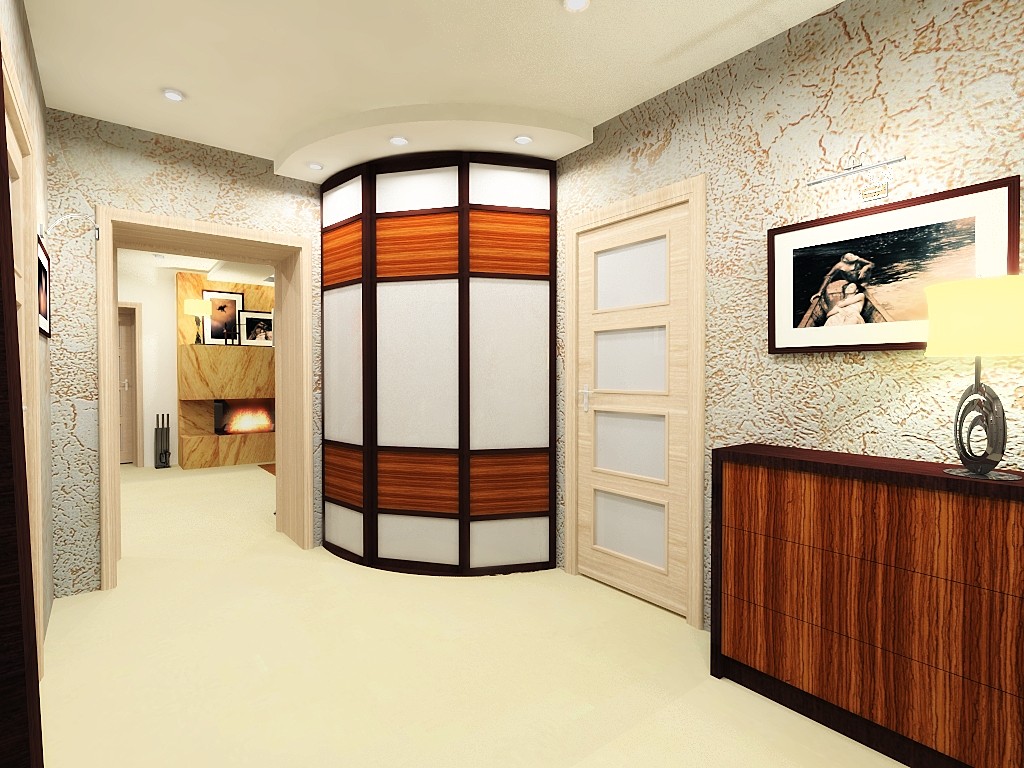 - Радиусный шкаф-купе. Такой вариант имеет достаточно сложные формы, так как может сочетать в себе самые разные детали: комод, банкетка и т.п. Радиусная конструкция может быть как выпуклой, так и выгнутой, и первый и второй вариант выглядит достаточно стильно. В маленькую прихожую такую конструкцию не поставить, поэтому в стандартных квартирах используется достаточно редко.
