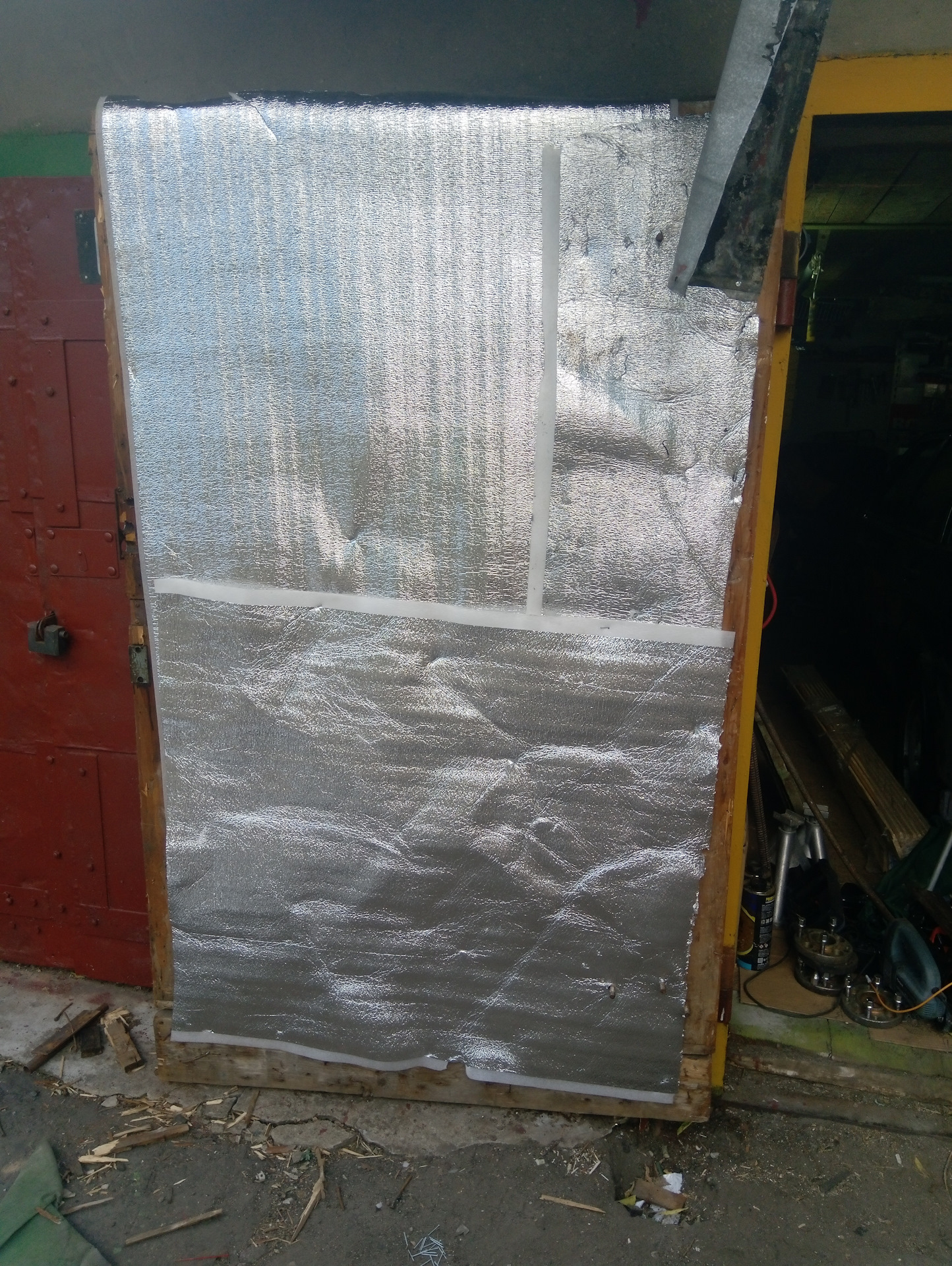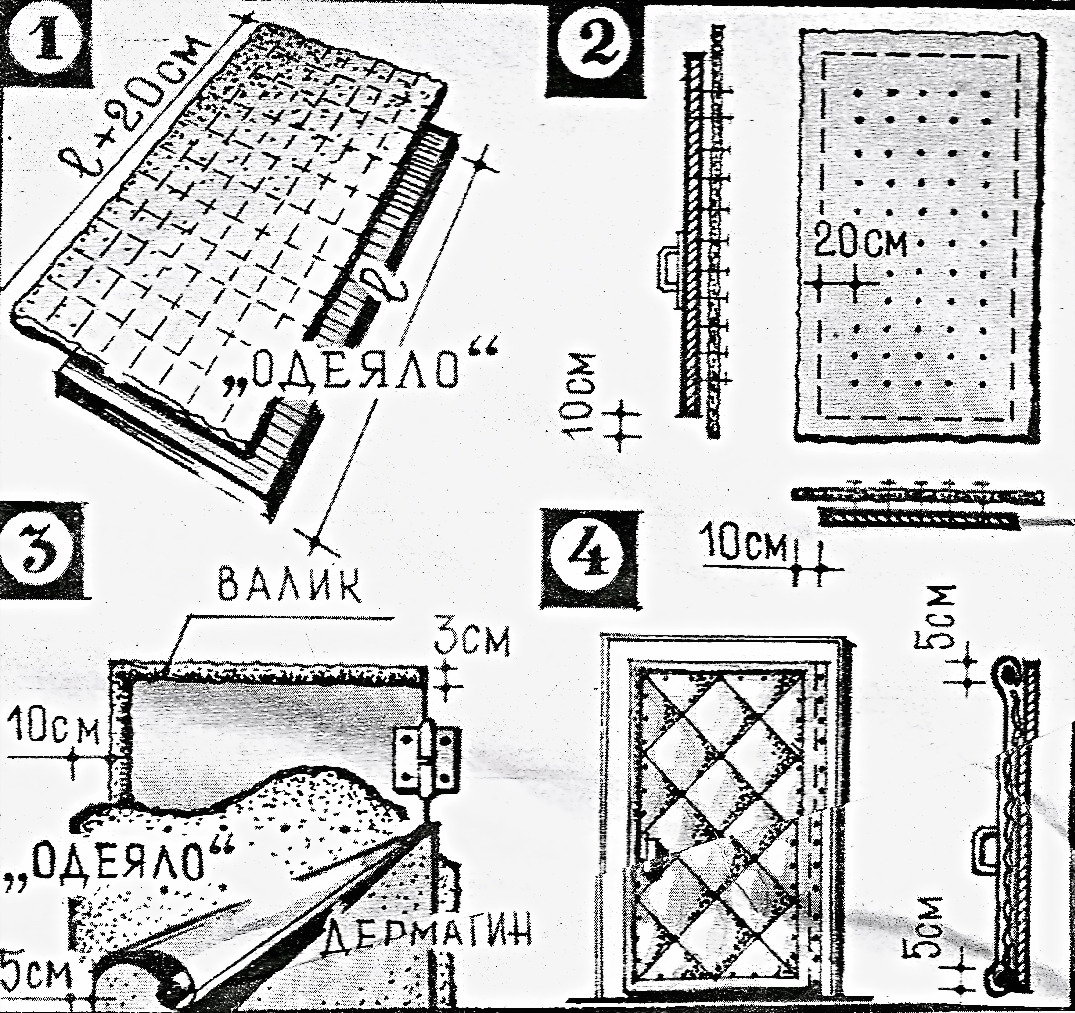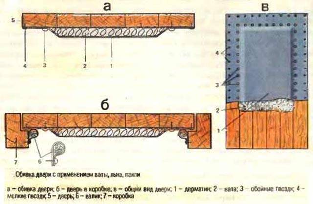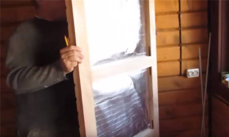 Из реек размером 20×20 мм изготавливается каркас, его величина должна быть меньше полотна на 15 мм по всему периметру. Полоса утеплителя шириной 40 мм складывается вдвое и набивается на рамку. При закрывании двери она будет выступать за границы полотна, и прикрывать зазоры. Внутрь прибитого каркаса укладывается теплоизоляционный материал (войлок, пенофол), а сверху накрывается листом фанеры, вырезанной по размеру рамки. Получившаяся конструкция существенно уменьшит проникновение холода.