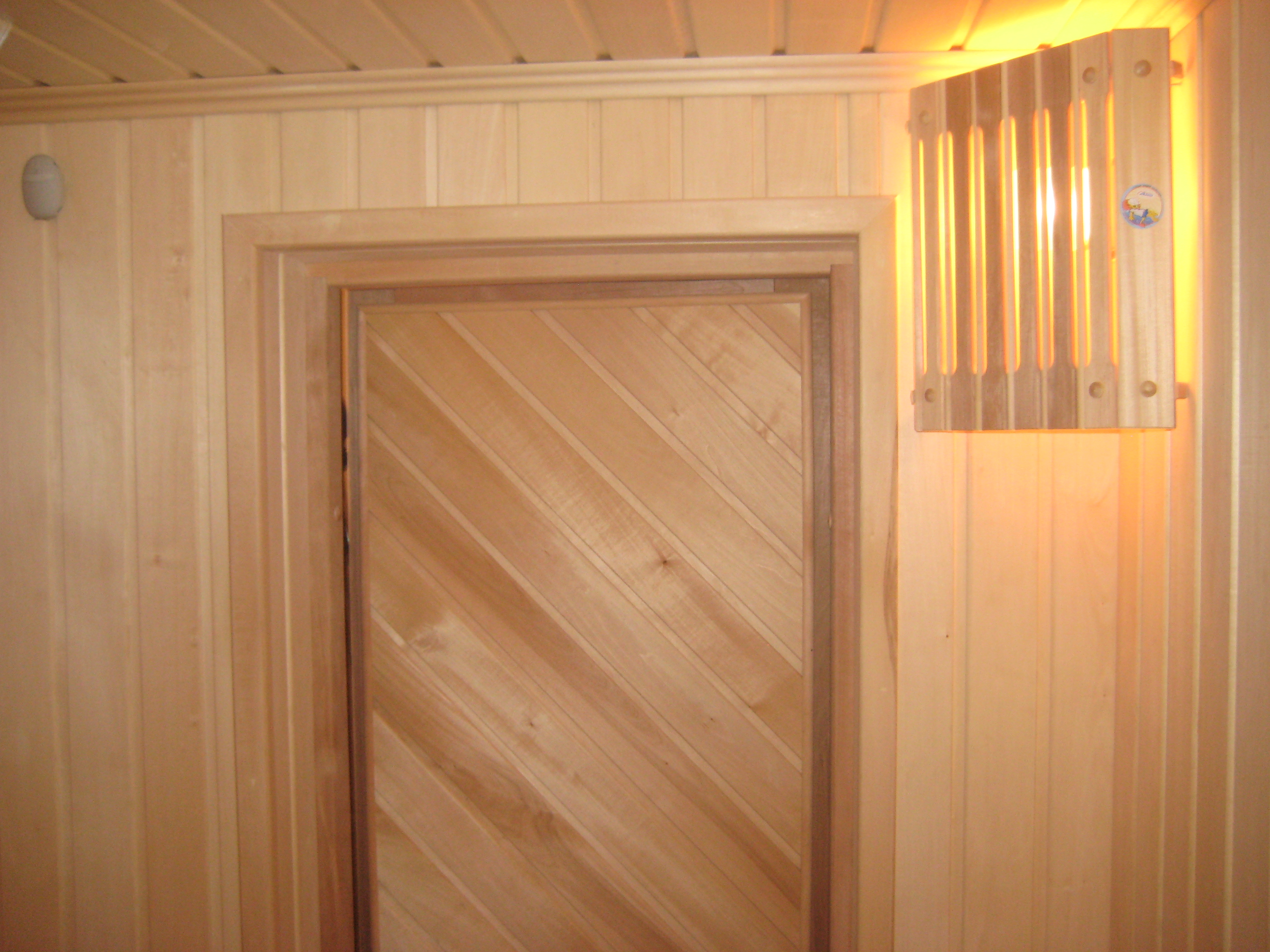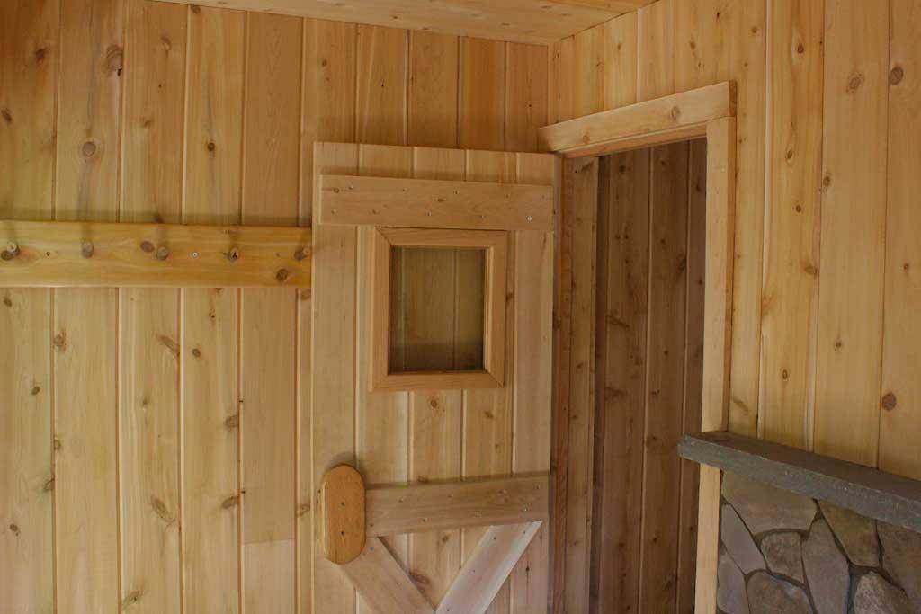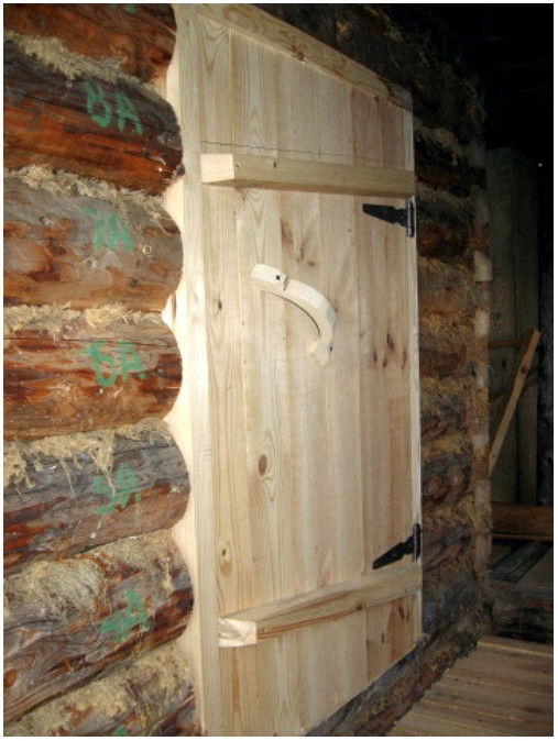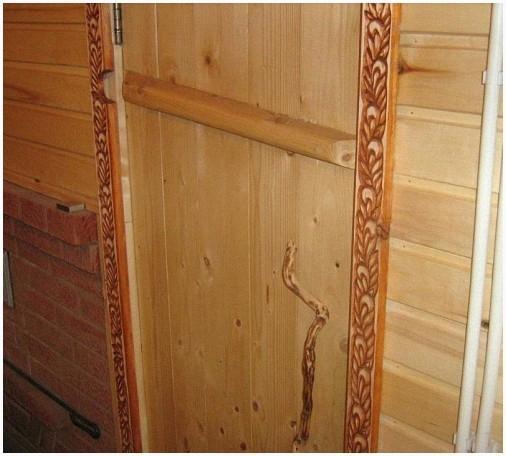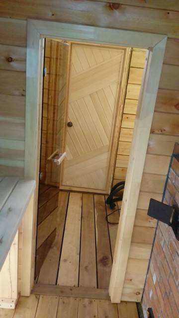 Небольшая площадь проема уменьшает потерю тепла. Открывается дверь всегда наружу, чтобы при плохом самочувствии человек без труда покинул парную. В качестве материала предпочтительней лиственные породы дерева, они не выделяют при нагревании смолу, как сосна или ель. На двери устанавливается минимальное количество железных элементов, которые при нагревании вызывают ожог. Ручка всегда изготавливается из дерева.