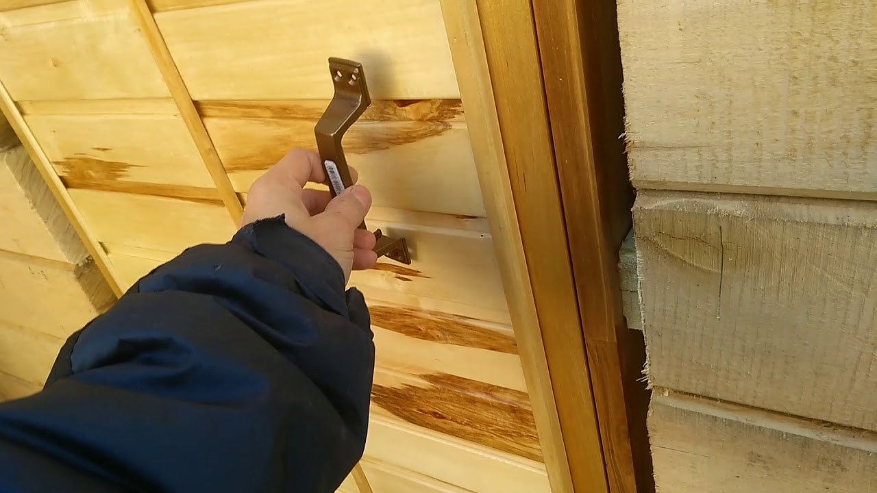 Все части двери фиксируются саморезами, длина крепежа должна доходить до второго каркаса. Торцы конструкции шлифуют наждачной бумагой. Дверь покрывают грунтовкой и краской, устанавливают петли и ручку.