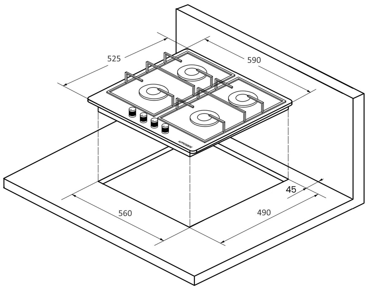 Габариты встраивания определяют объем, который потребуется вырезать из столешницы. Панель опускается в прорезь на высоту встраивания, которая может достигать 10 см; следует убедиться, что дизайном кухни под панелью предусмотрено достаточно места. Кроме того, желательно оставить дополнительно 3-4 см для подвода газа.