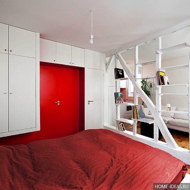 Этот громоздкий предмет мебели сродни стеновой перегородке. Он стоит монументально и убрать его при необходимости быстро не получится. В остальном же решение весьма даже удобное. Разделение комнаты шкафом можно сделать максимально функциональным. В этом случае в зоне спальни должен оказаться гардероб, а в гостиной части – открытые полочки, заполненные милыми мелочами или книгами. Нужно учитывать, что шкафу, в отличие от декоративной ширмы или иного рода перегородки, потребуется много места, так что использовать его в этой роли в малогабаритной комнате не целесообразно.