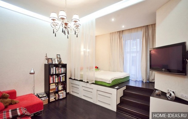 Но будьте внимательны, не используйте подиумы в квартирах с низкими потолками, поскольку они отнимают высоту, а вы рискуете сделать помещение очень «коротким».