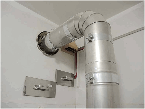 Вытяжка ставится непосредственно над отопительным котлом, тогда как воздуховод монтируется за топливной камерой.
