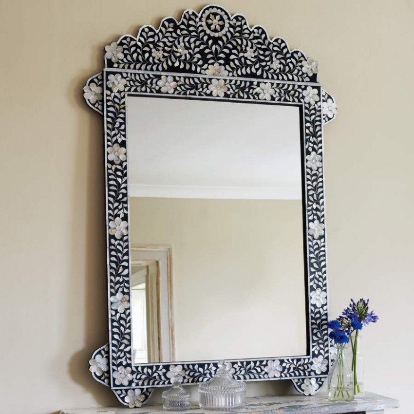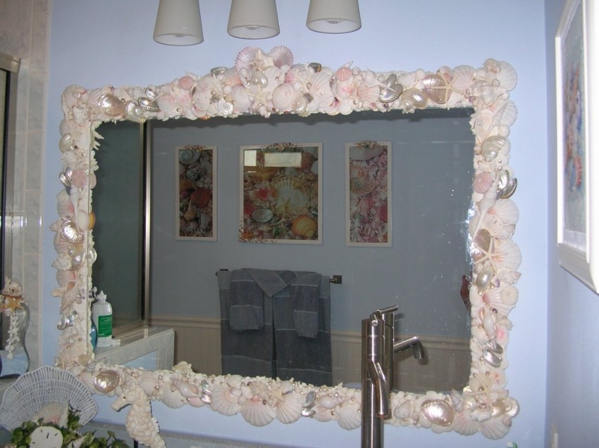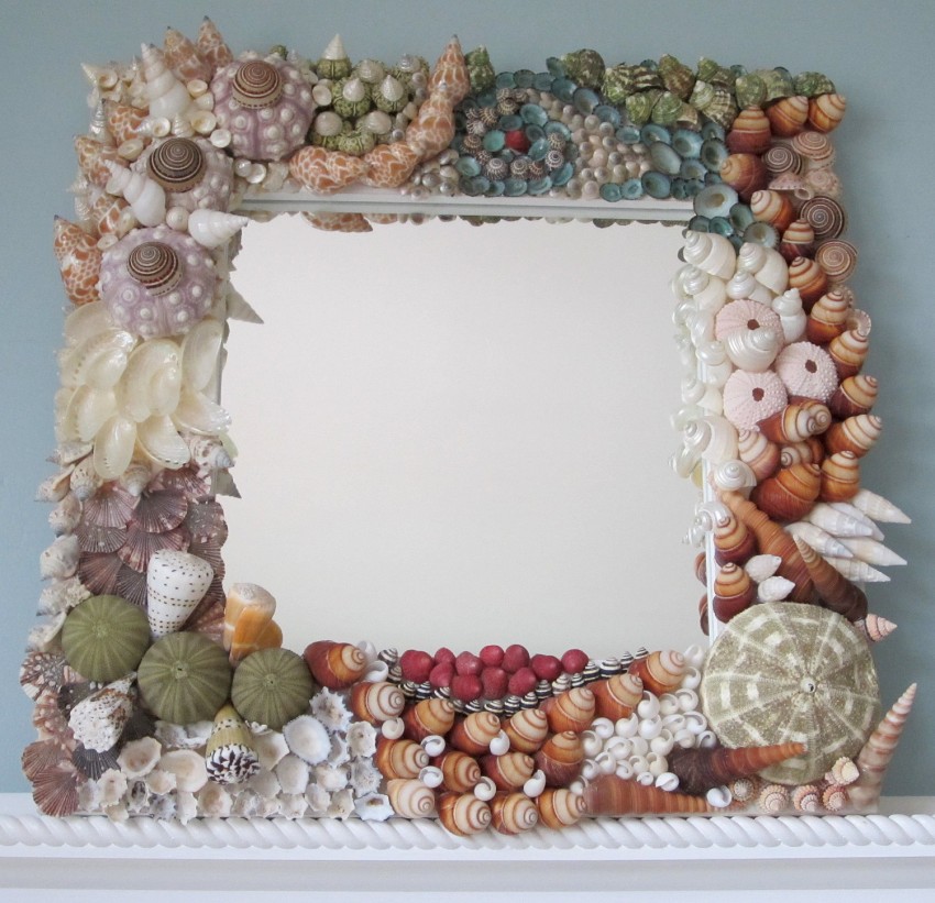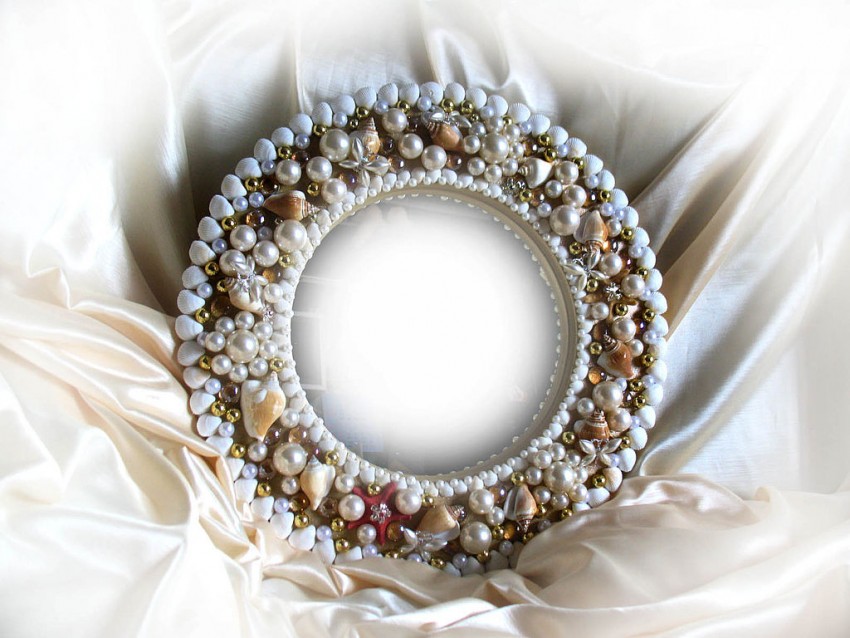 Интерьер в индийском стиле поможет создать прямоугольная модель в роскошной широкой раме, узор на которой сформирован ракушками и камешками небольших размеров. Чтобы зеркало не стало обособленным пятном в интерьере, дополните его соответствующими аксессуарами, сувенирами и столиком, выполненными в том же стиле, что и рама.