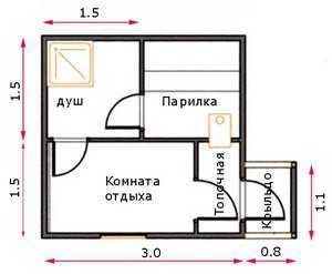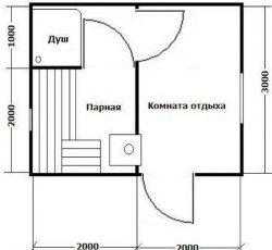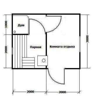 Под парную выделяется пространство минимум 1,5х1,8 м, с учетом места под котел или печку и удобным расположением одного человека на полке. Зонировать помещение рекомендуется так: для комнаты отдыха выделяют 2х3 м, для парилки 2х2 м, для помывочной 1х2 м.