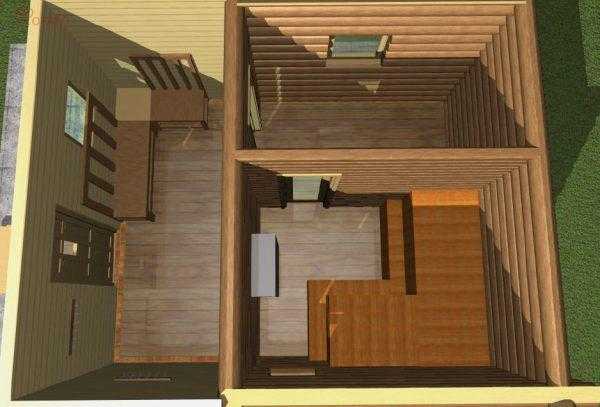 Комнаты имеют одинаковые габариты: 3×2 метра. Для удобства возле бани предусмотрено крылечко, можно пристроить небольшой тамбур с размерами 1×1 метр.