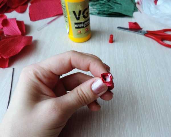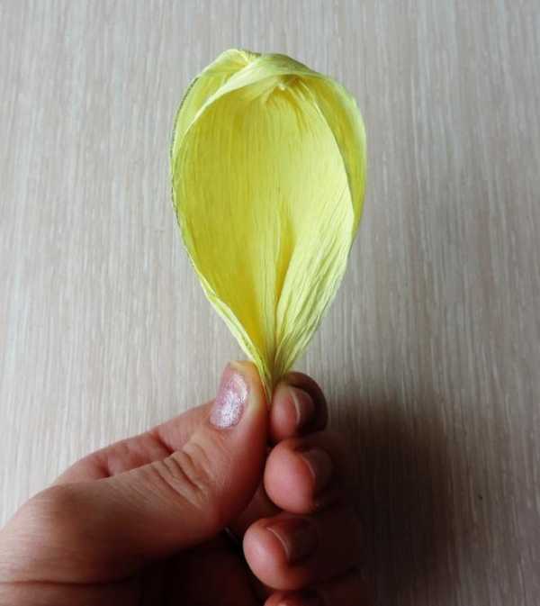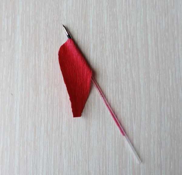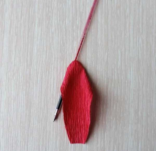 Далее необходимо придать им форму. Центральная часть растягивается в одну сторону, как бы создавая небольшой кармашек, а верх лепестка закручивается в том же направлении. Получается отличная заготовка для розы, которая потом наматывается на стебелек-основу. Уже потом из них собираются готовые весенние букеты, своими руками созданные всей семьей.