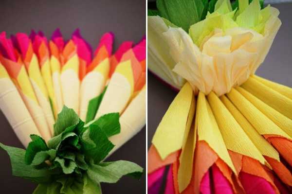 КАК СДЕЛАТЬ ОБЪЕМНЫЕ РАСКРЫВШИЕСЯ ЦВЕТЫ И СПРЯТАТЬ В БУТОНЫ КОНФЕТЫ. ФОТО УРОК — ДЕЛАЕМ ИЗ ГОФРИРОВАННОЙ БУМАГИ БОЛЬШОЙ ЦВЕТОК С КОНФЕТКОЙ.