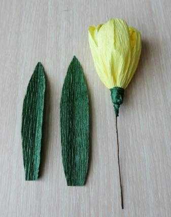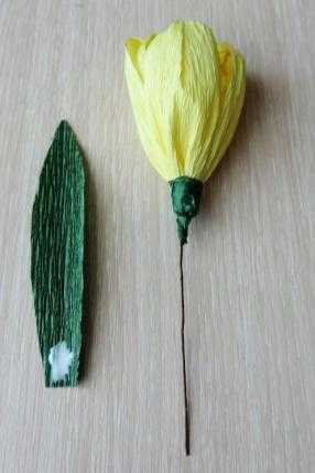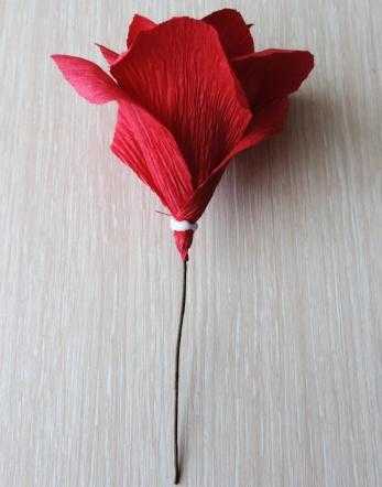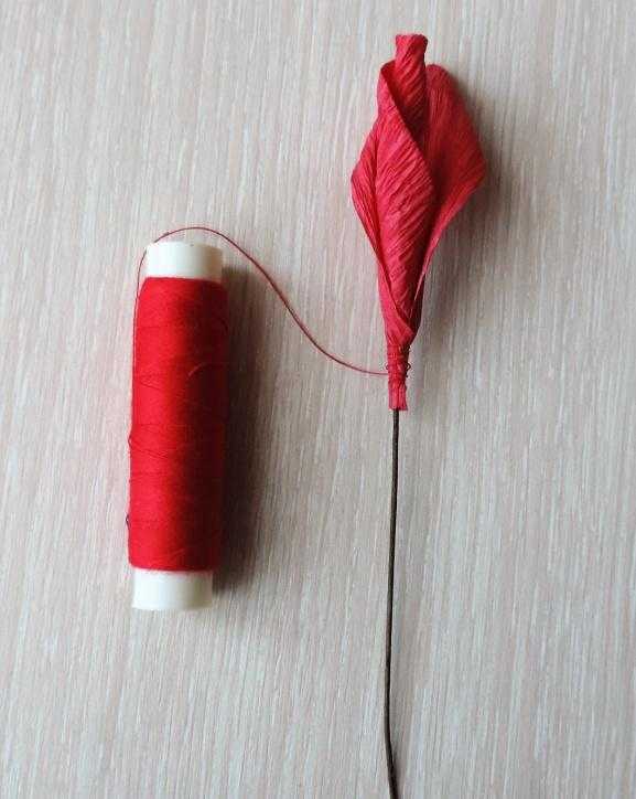 Собирается готовый цветок очень просто: на основание ниткой приматывается 1 лепесток, внахлест к нему второй и завершает коронку третий. Нужно рассчитать ширину нахлеста таким образом, чтобы именно 3 лепестка создавали готовый цветок. В конце обматываем стебель зеленой бумагой и приматываем такого же цвета длинный листик или два, в зависимости от задумки.