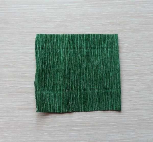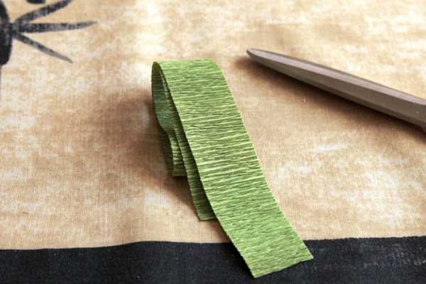6. Приготовьте небольшую часть зеленой бумаги (зеленого отрезка бумаги на изображении хватило на 2 цветка). С данным отрезком нужно поступить, так же как и с предыдущим — сделать надрезы и скрутить их.