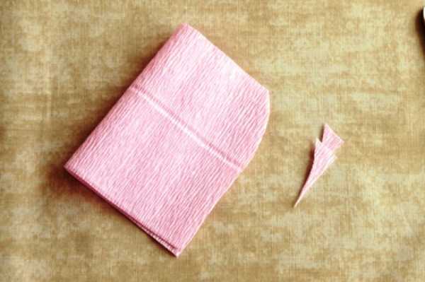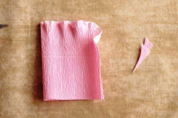 5. Возьмите лист бумаги и отрежьте прямоугольник побольше предыдущего. Это будет следующая часть розы. Цвет сочный розовый. Нарежьте 4 лепестка.