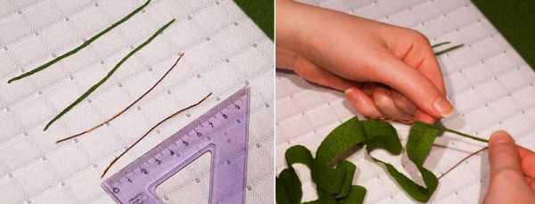 8. Разрежьте проволоку на отрезки 6-8 см для черенков листьев. Обмотайте черенки полосками зеленой бумаги.
