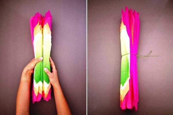 1. Отрежьте лист гофрированной бумаги от рулона. Теперь сложите этот лист гармошкой. То же самое сделайте со всеми цветами бумаги.