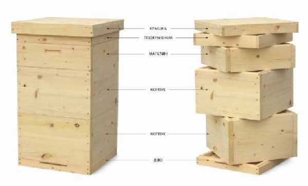 Независимо от габаритов и других особенностей улей Дадана-Блатта состоит из следующих элементов: