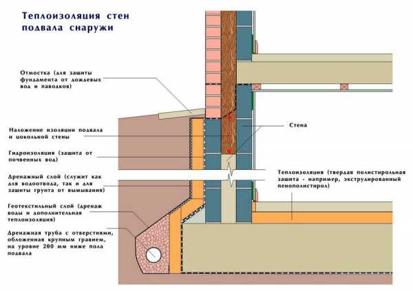 Гидроизоляция защищает конструкцию от внешних осадков и грунтовых вод. Изоляцию конструкции от влаги проводят в двух уровнях. Первый слой укладывается на высоте 15-20 см над уровнем грунта снаружи цоколя, а вторым защищается от влаги пол подвала.