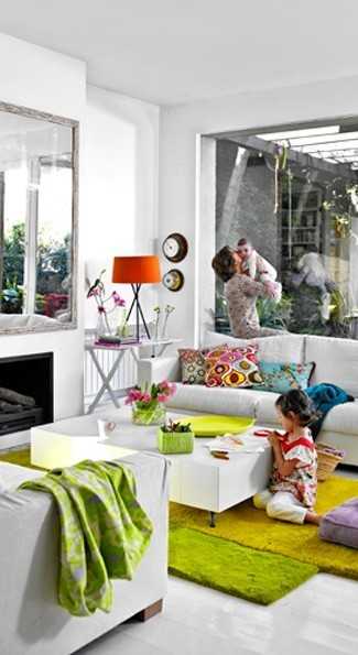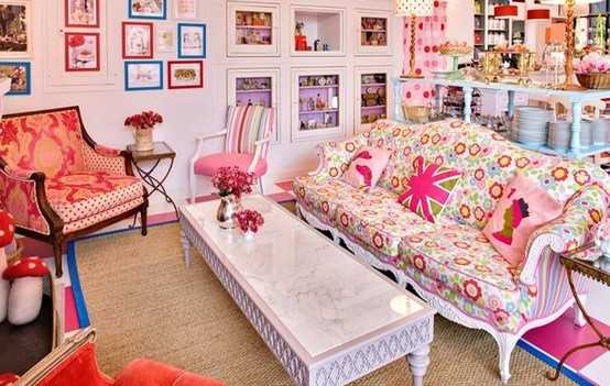 К ярко-розовому и бирюзовому оттенкам в декоре этой гостиной присоединились насыщенный голубой и мятно-зелёный.