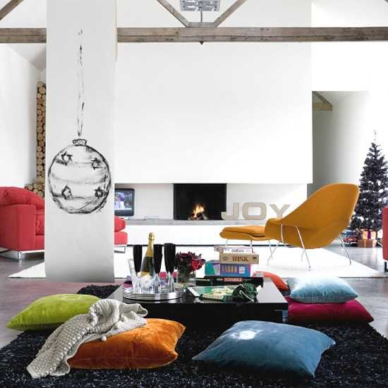 Яркие подушки и ковёр в причудливом дизайне формируют дерзкий образ этой гостиной.