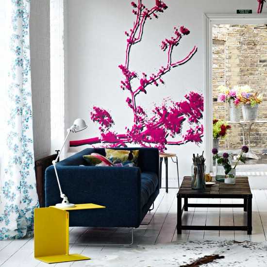 Декоративное панно, изображающее ветвь дерева цвета фуксии, диван глубокого синего оттенка и жёлтая тумба в индустриальном стиле создают эклектичный образ этой компактной гостиной.
