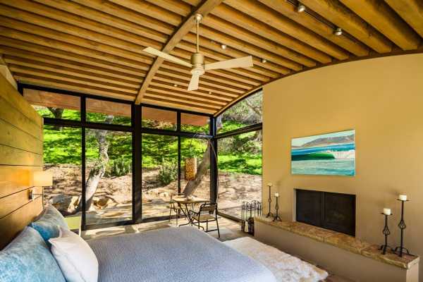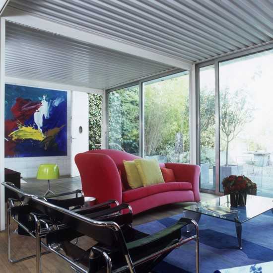 Этот мрачноватый интерьер выглядит более жизнерадостно благодаря наличию ярких элементов и обилию дневного света, проникающего через застеклённую стену.