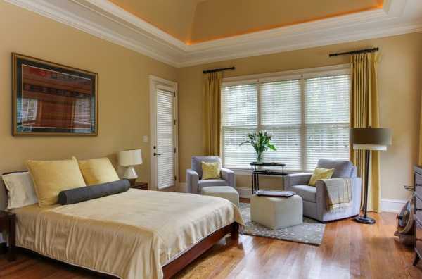 Факт! Если в узкой и длинной спальне выкрасить противоположные стены в желтый, а остальные (более длинные) сделать светлыми (кремовыми, белыми, жемчужными), то можно сделать помещение квадратным.